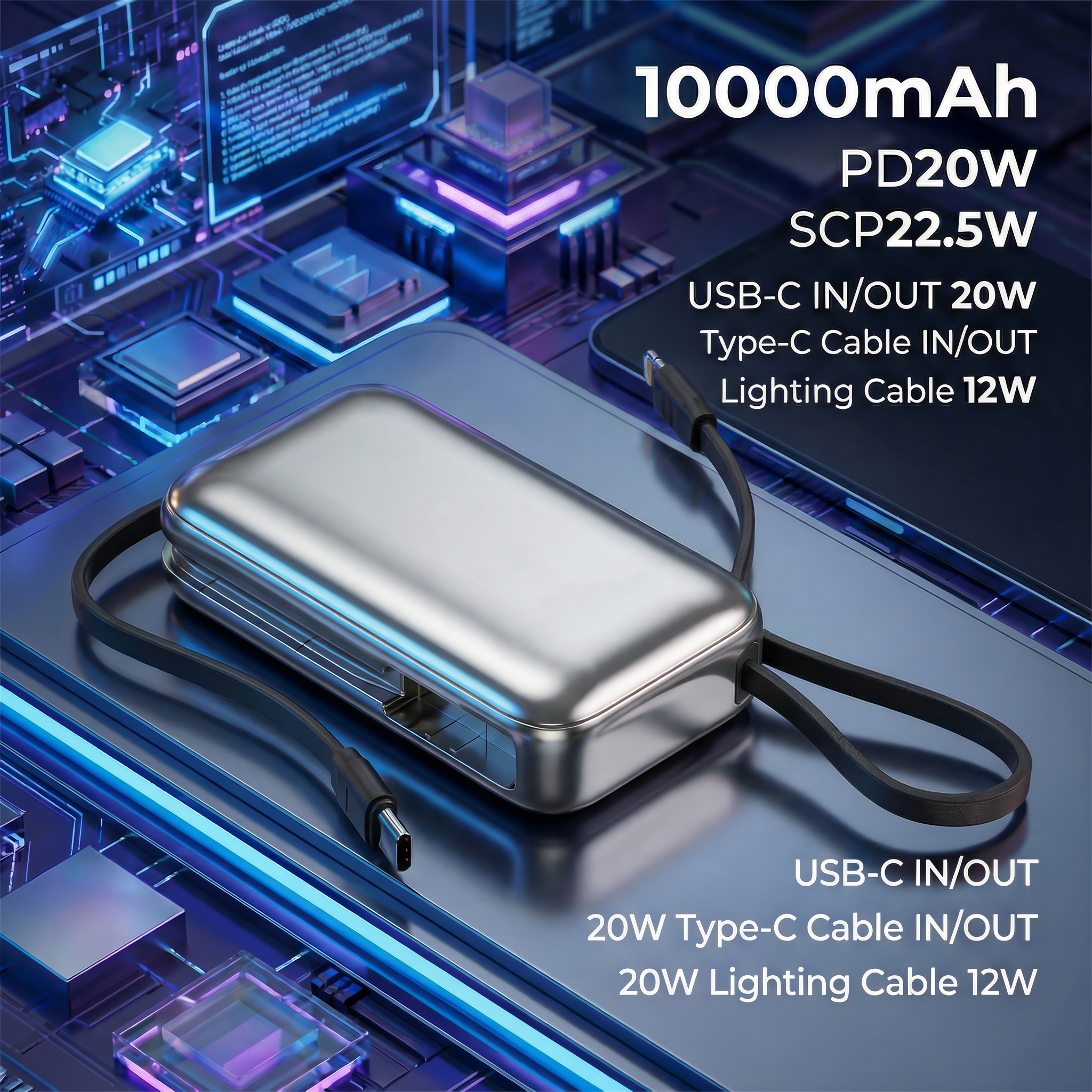 Baterie externa 10000mAh cu incarcare rapida PD 20W si SCP 22.5W, cabluri integrate