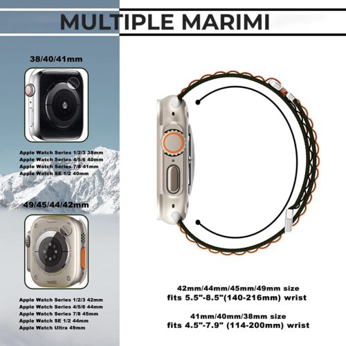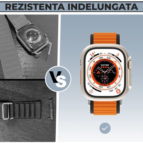 Curea Daden® textil Nylon este compatibila cu Apple Watch seria 1/2/3/4/5/6/7/8/SE/Ultra si se regaseste in doua marimi (38/40/41mm si 42/44/45/49mm).