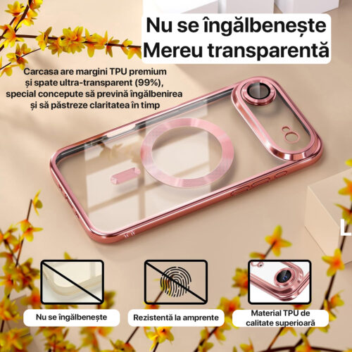 Husa pentru iPhone 17 Air DaDen® MagSafe Luxury, Antisoc, Protectie Camera, Margini Metalizate, Transparenta cu Margini Roz