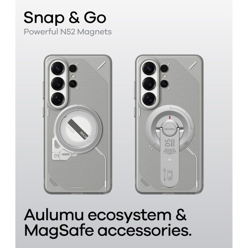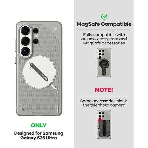 Husa pentru Samsung S26 Ultra, Aulumu Frosted, TPU rezistent, Compatibila MagSafe, Efect fosforescent, Protectie Camera, Butoane aluminiu, Racire activa CoolHyper, Protectie premium, Gri/Transparent