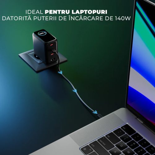 - Putere maxima de pana la 140W, suficienta pentru a incarca rapid laptopuri puternice.