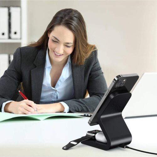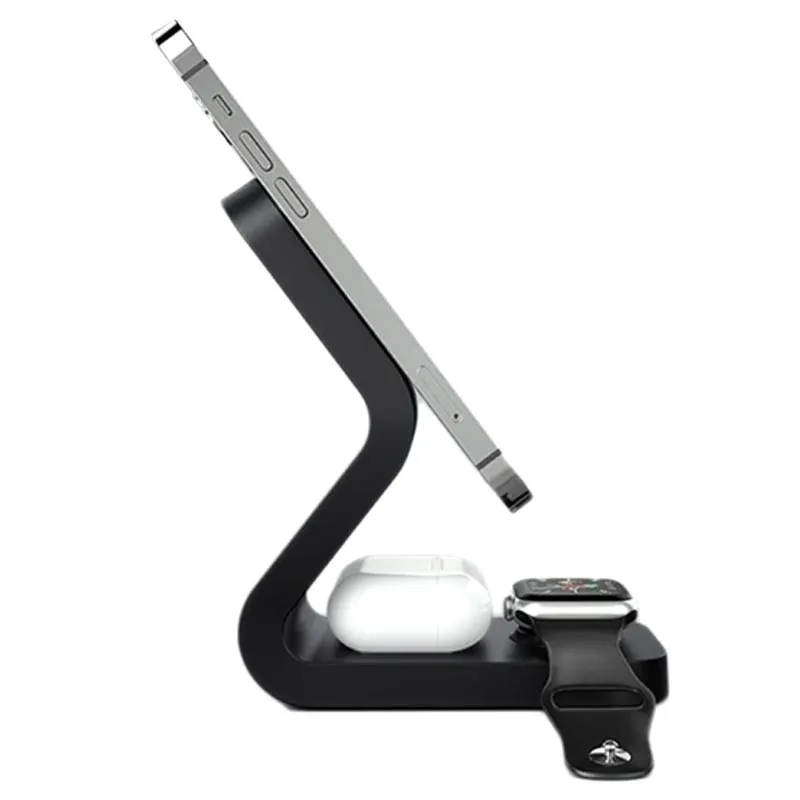 Acest suport incarca simultan telefonul mobil, DOAR ceasul smart Apple Watch si castile: Airpods/Galaxy Buds/Casti cu incarcare wireless, fiind accesoriul ideal pentru o mai buna organizare a spatiului de pe biroul/noptiera dumneavoastra.