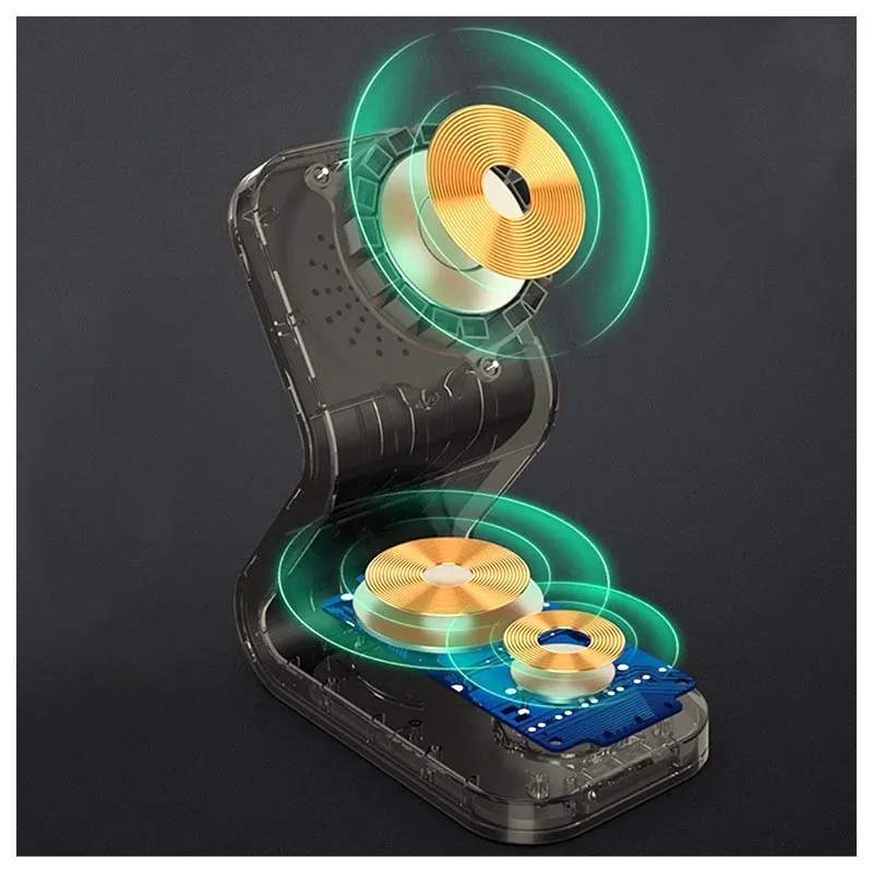 Standul va aprinde o lumina albastra stralucitoare placuta la incarcarea unui telefon mobil sau lumina verde stralucitoare, la incarcarea iwatch-ului sau a airpod-urilor, sau in stare de asteptare.