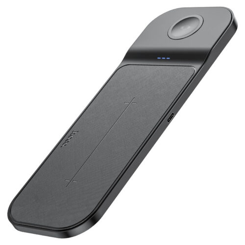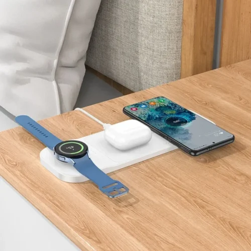 Incarcatorul HOCO CQ5 este un dispozitiv versatil care iti permite sa incarci wireless trei dispozitive diferite in acelasi timp.